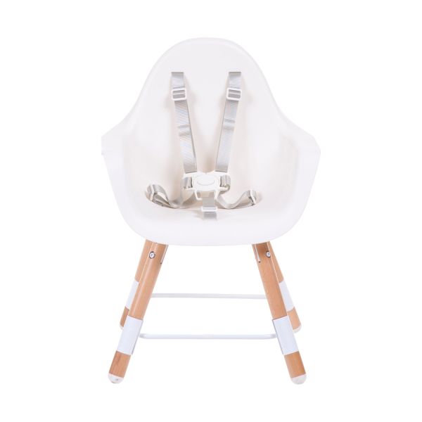 Deze Childhome Evolu 2 Chair in de kleur naturel/wit is een hippe 2-in-1 eetstoel die zich aanpast aan 2 gebruikelijke tafelhoogtes: