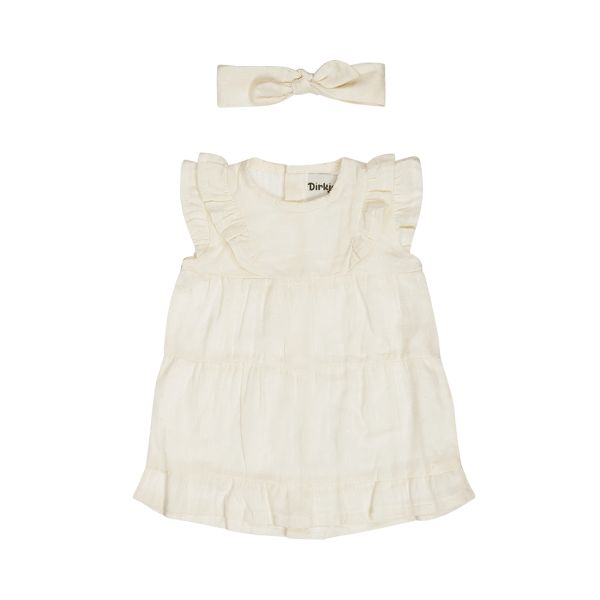 Een prachtige zomeroutfit voor je kleintje! Dit Dirkje jurkje in maat 56 is uitgevoerd in een lichte off-white tint en wordt geleverd met een bijpassende haarband. De luchtige stof, schattige ruches en knoopsluiting aan de achterkant maken dit jurkje perfect voor zonnige dagen of een speciale gelegenheid.