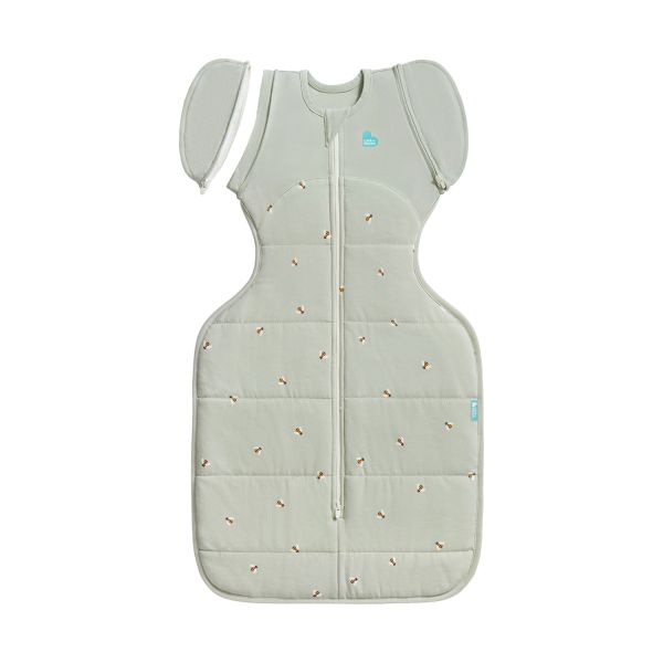 De Love To Dream Transition Bag Inbakerslaapzak - Fase 2 - Maat M - Olive Bees is de ideale keuze voor baby’s die klaar zijn om de stap te zetten van inbakeren naar zelfstandig slapen. Dankzij de afritsbare mouwen kun je deze overgang geleidelijk en op een veilige manier begeleiden. Zo voelt je kindje zich nog steeds geborgen, maar krijgt het stap voor stap meer bewegingsvrijheid.