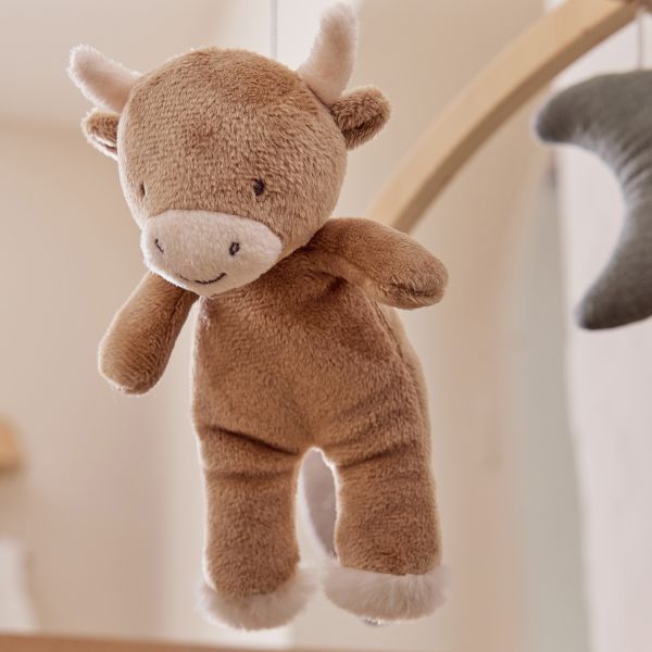 De Noukie's F&O Muziekmobiel Met Houten Arm combineert natuurlijke materialen met tedere details. De houten arm draagt figuurtjes als Orso en Fluffy in zachte tinten, die rustig boven de baby wiegen. Terwijl de figuren draaien, speelt de mobiel de zachte melodie “Lullaby” van Brahms en schept zo een rustgevende sfeer in de babykamer.