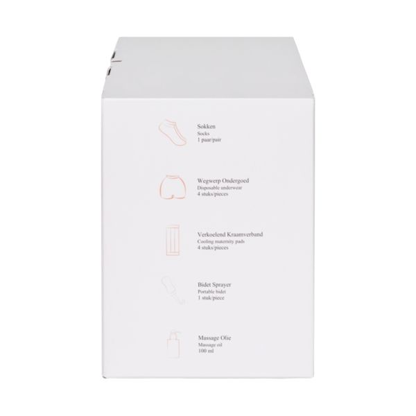 Het verkoelende kraamverband verzacht zwelling en pijn, terwijl het zachte wegwerp ondergoed ervoor zorgt dat het verband goed op zijn plaats blijft en niet verschuift. De peri bottle (bidet sprayer) helpt bij het reinigen van de intieme zone en verlicht het branderige gevoel bij toiletbezoek. De massageolie is ideaal om tijdens de bevalling ontspanning en verlichting te bieden – bijvoorbeeld met een rugmassage tijdens de weeën.