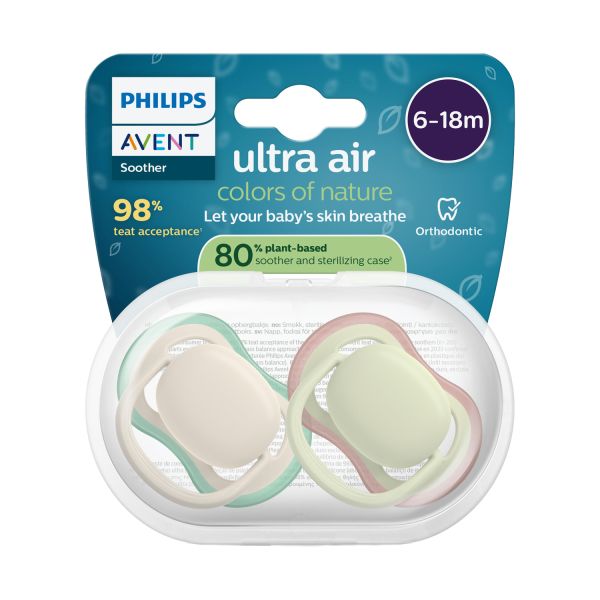 De Ultra Air-fopspeen bestaat uit circa 80% plantaardig materiaal in de harde onderdelen en is volledig vrij van BPA. Het orthodontische ontwerp met zachte siliconen speen ondersteunt de natuurlijke ontwikkeling van het gehemelte, de tongspieren en de tanden. De smalle speenhals helpt de druk in het mondje van je baby te verminderen.